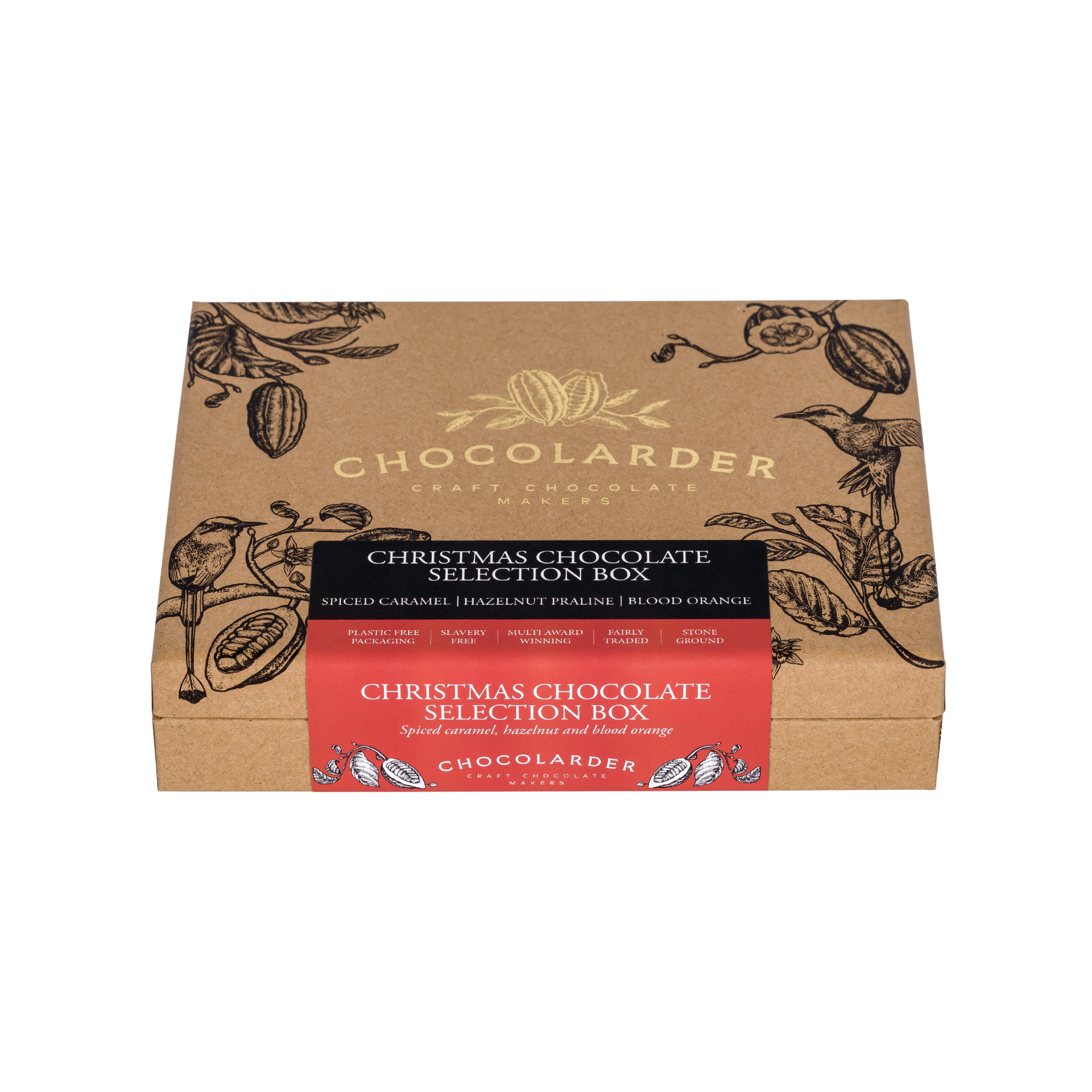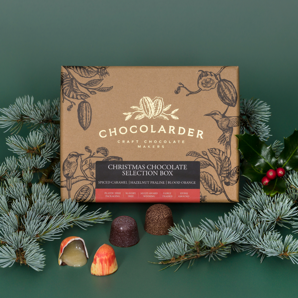 • A mixed chocolate box with three flavours, blood orange, hazelnut praline and spiced caramel.